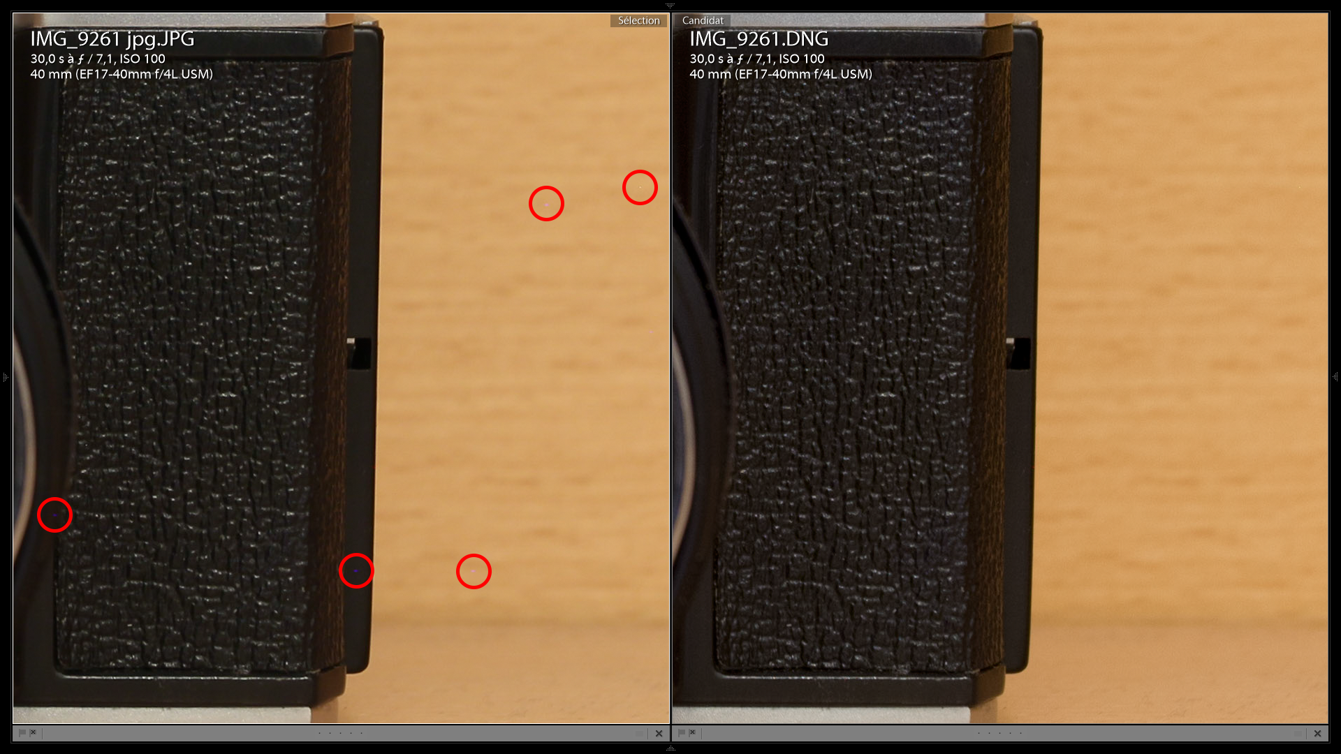 Dans cet exemple, j’ai utilisé un temps de pose de 30s et j’ai réglé la qualité d’image en JPG + RAW. Des pixels chauds sont visibles sur le JPG, mais pas sur le RAW :