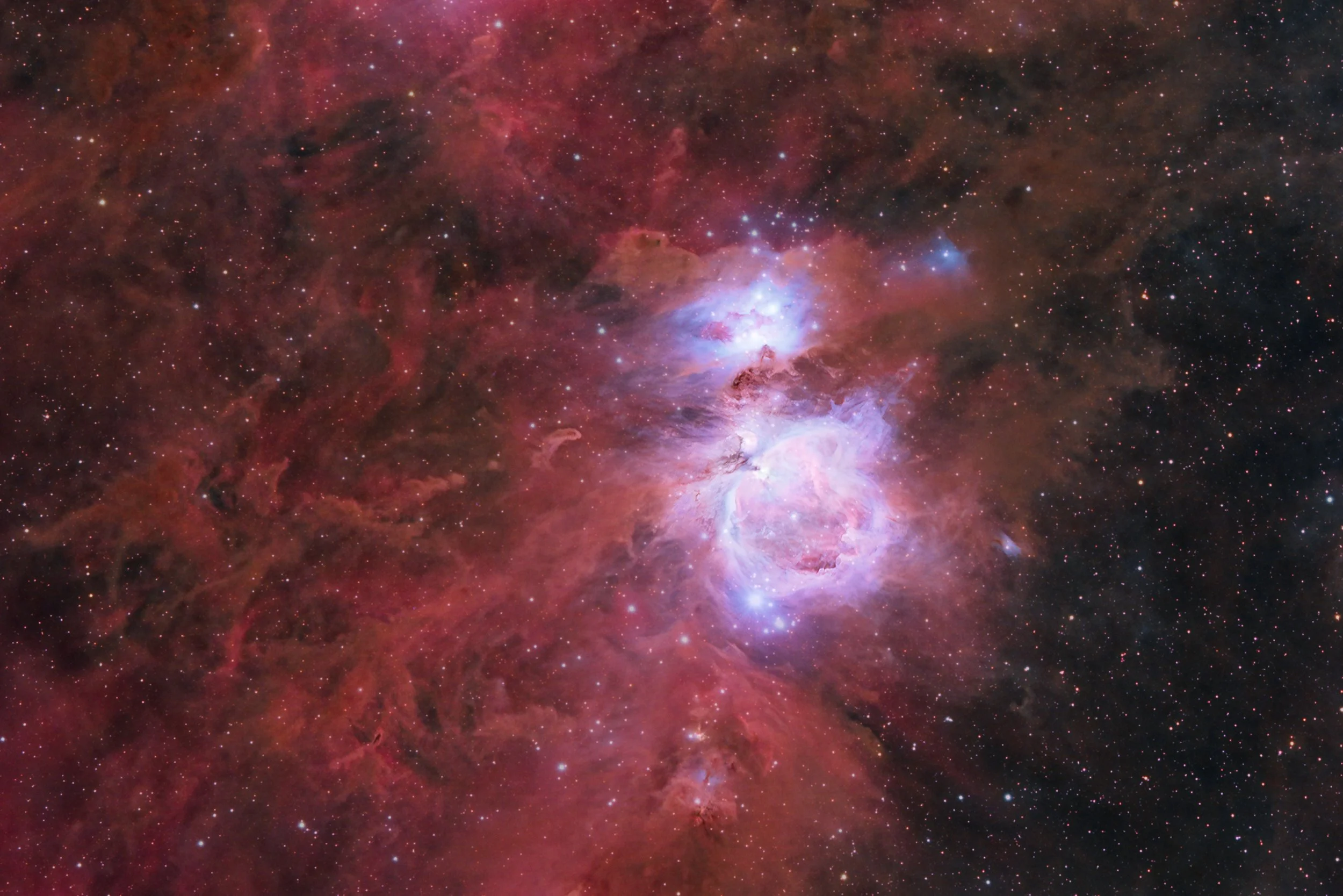 • Temps d’intégration : 2h par tuile/zone de la mosaïque (60 x 2 min) + 3 séries de photos moins exposées pour le cœur d'Orion. Au total, l'image est donc le fruit de 20 heures, 6 minutes et 32 secondes d'intégration. (120s x 600 + 30s x 10 + 8s x 9 + 2s x 10)